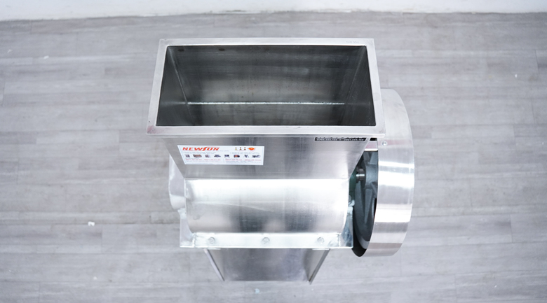 Máy chặt mỡ đông lạnh được trang bị cửa nạp nguyên liệu dạng hộp chữ nhật đứng, kích thước 40x18cm, cho phép đưa trực tiếp các khối mỡ lớn từ 5–10kg (tối đa 37x17cm) vào xử lý dễ dàng. Phía trên cửa nạp có nắp đóng mở tiện lợi, vừa an toàn vừa ngăn bụi bẩn rơi vào khoang cắt.