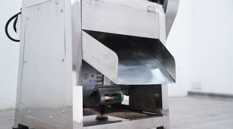 Thành phẩm sau khi cắt sẽ đi ra qua cửa xả dạng máng nghiêng, có 2 thanh chắn cố định hai bên để hạn chế mỡ bắn ra ngoài, giữ khu vực làm việc luôn sạch sẽ.