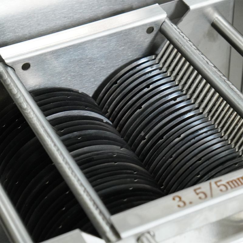 So với nhiều dòng máy thông dụng chỉ sử dụng lưỡi dao dạng nguyên khối, máy thái thịt tươi sống NS-TQ-III được thiết kế bộ dao có cấu trúc cải tiến. Trên mỗi lưỡi dao đều được gia công thêm các rãnh nhỏ nhằm hỗ trợ quá trình đưa thịt vào dao cắt hiệu quả hơn. Kết hợp với vật liệu thép S420 có độ cứng và độ bền cao theo tiêu chuẩn châu Âu, bộ dao giúp máy vận hành trơn tru, cắt nhanh và nâng cao hiệu suất làm việc rõ rệt.