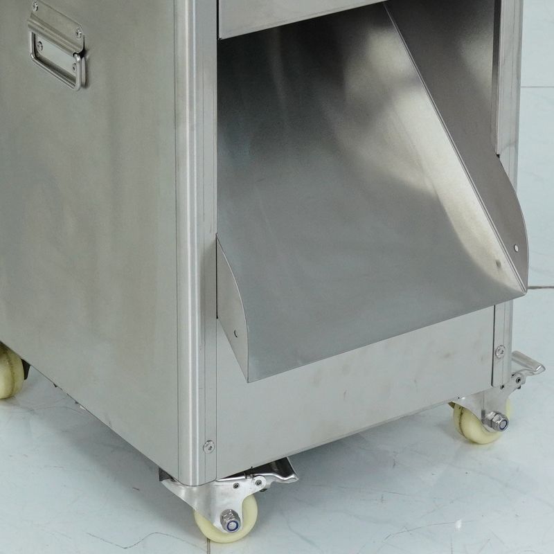 Máy thái thịt tươi sống TQ-III có kiểu dáng hình chữ nhật thẳng đứng và chắc chắn. Thiết kế này giúp tiết kiệm diện tích và dễ bố trí trong khu vực chế biến.